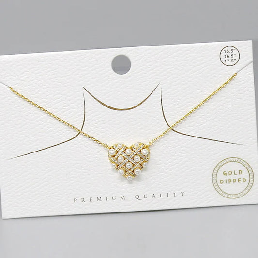 Heart CZ & Pearl Pendant Gold Dipped Necklace