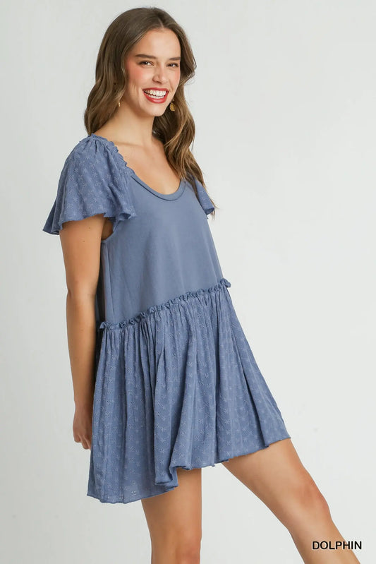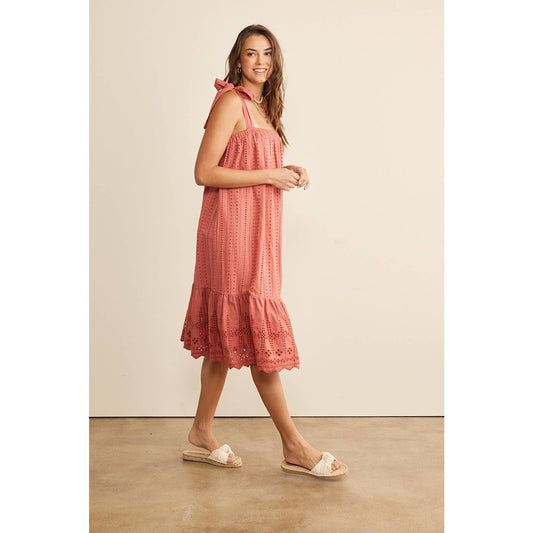 SHOULDER TIE RUFFLE HEM EYELET SHIFT MIDI DRESS