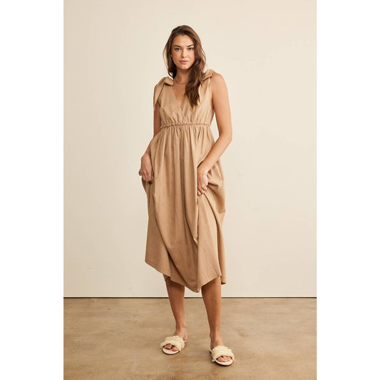 LINEN BLENDED SHOULDER TIE MIDI DRESS