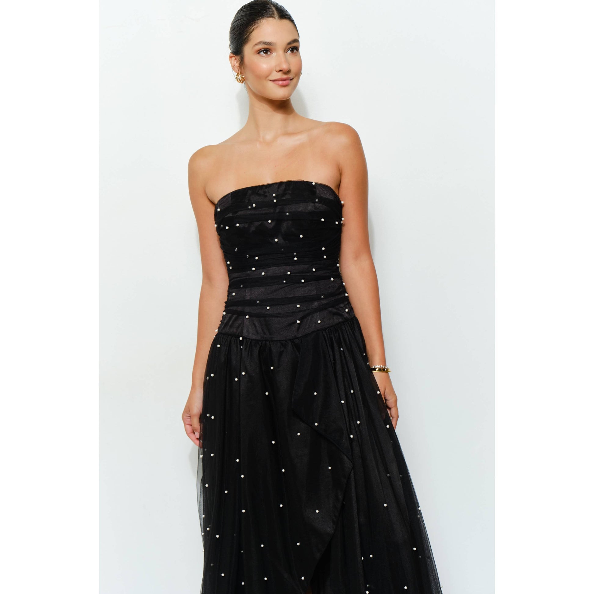 Pearl-Embellished Layered Tulle Maxi Dress -Strapless design with a fitted, ruched bodice for a refined silhouette -Sheer layered tulle skirt adds volume and graceful movement -Scattered pearl embellishments create a delicate, luminous finish -High-low wrap-effect hem reveals legs with elegance -Back zipper closure for a clean, tailored fit -Perfect for weddings, special events, or evening parties